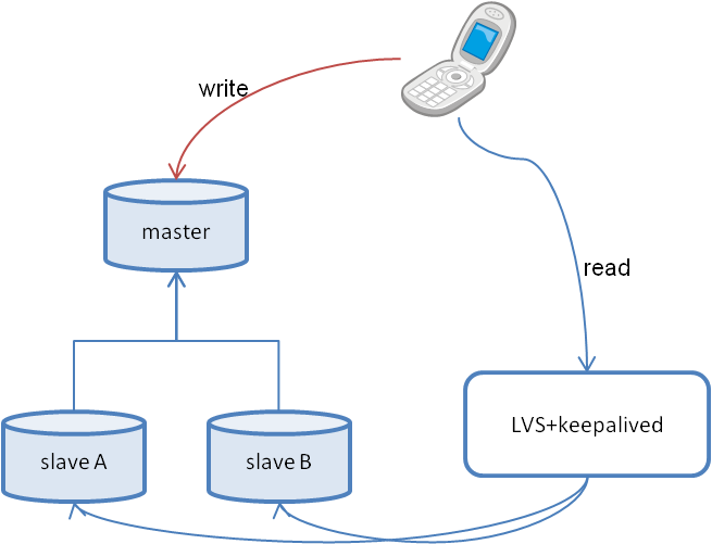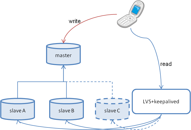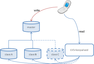 下図のように、master1台←slave2台がLVS+keepalivedで負荷分散構成されているDBがあるとします。